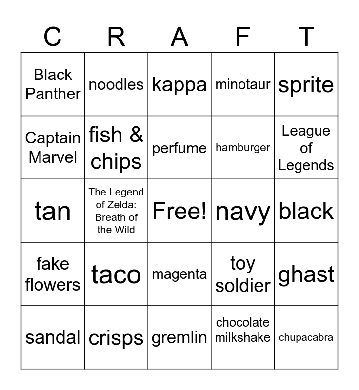 This bingo card has a free space and 24 words: taco, crisps, perfume, sandal, sprite, Black Panther, Captain Marvel, noodles, navy, magenta, hamburger, tan, toy soldier, ghast, fish & chips, chocolate milkshake, black, kappa, League of Legends, The Legend of Zelda: Breath of the Wild, chupacabra, fake flowers, minotaur and gremlin.