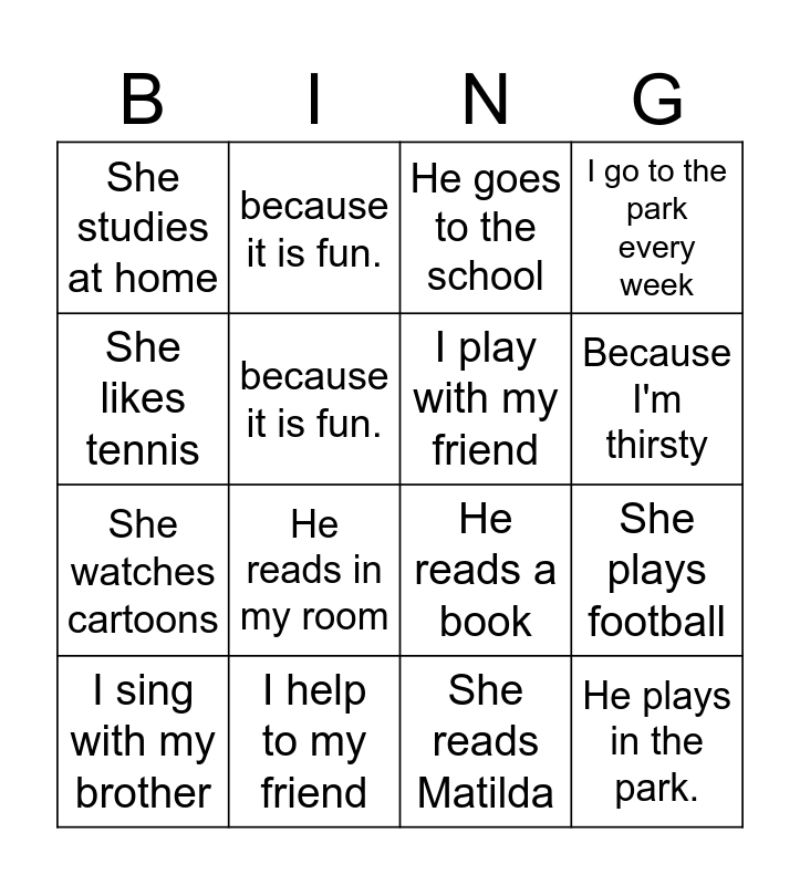 This bingo card has 20 words: She plays football, I play football on Saturday., He goes to the school, I go to bed at 10:00., I sing with my brother, She likes tennis, I help to my friend, She studies at home, She watches cartoons, because it is fun., He reads in my room, He reads a book, because it is fun., He plays in the park., I play with my friend, She does homework at night., Because I'm thirsty, I go to the park every week, She reads Matilda and He visits my grandma.