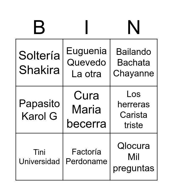 This bingo card has a free space and 8 words: Los herreras Carista triste, Bailando Bachata Chayanne, Euguenia Quevedo La otra, Tini Universidad, Soltería Shakira, Qlocura Mil preguntas, Papasito Karol G and Factoría Perdoname.