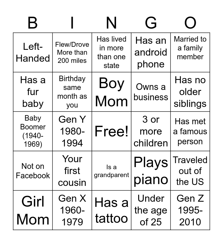 This bingo card has a free space and 24 words: Your first cousin, Gen X 1960-1979, Boy Mom, Girl Mom, Married to a family member, Left-Handed, Has a fur baby, Flew/Drove More than 200 miles, 3 or more children, Is a grandparent, Owns a business, Baby Boomer (1940-1969), Plays piano, Traveled out of the US, Birthday same month as you, Under the age of 25, Has met a famous person, Has lived in more than one state, Has no older siblings, Gen Y 1980-1994, Gen Z 1995-2010, Not on Facebook, Has an android phone and Has a tattoo.