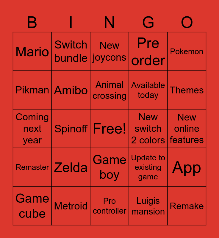 This bingo card has a free space and 24 words: Zelda, Metroid, Animal crossing, Game cube, Pokemon, Mario, Pikman, Switch bundle, New switch 2 colors, Game boy, Available today, Coming next year, Update to existing game, App, Amibo, Luigis mansion, New online features, New joycons, Themes, Spinoff, Remake, Remaster, Pre order and Pro controller.