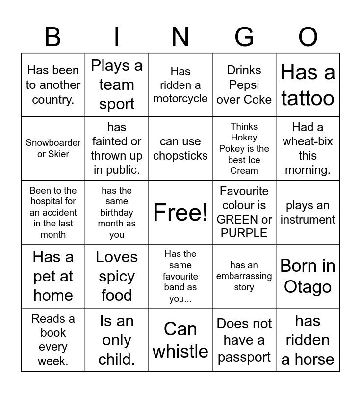 This bingo card has a free space and 28 words: Born in Otago, Had a haircut in the last month, Thinks Hokey Pokey is the best Ice Cream, Does not have a passport, Snowboarder or Skier, Has ridden a motorcycle, Plays a team sport, Has a pet at home, Favourite colour is GREEN or PURPLE, Reads a book every week., Been to the hospital for an accident in the last month, Drinks Pepsi over Coke, Is an only child., Can whistle, Had a wheat-bix this morning., ...snores, Loves spicy food, has fainted or thrown up in public., can use chopsticks, Has the same favourite band as you..., Has been to another country., has met a celebrity, has ridden a horse, has the same birthday month as you, plays an instrument, has an embarrassing story, Has a tattoo and has run a marathon.