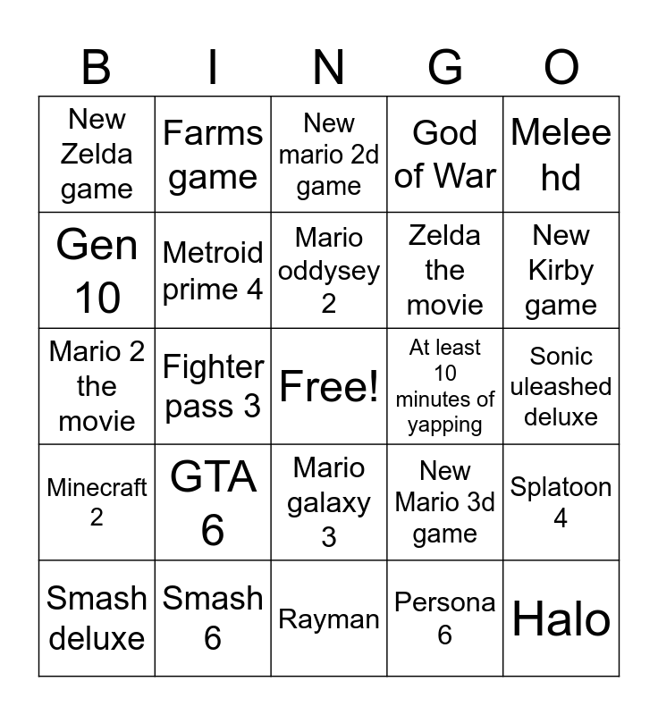 This bingo card has a free space and 24 words: GTA 6, Smash 6, Mario oddysey 2, Smash deluxe, Melee hd, New Zelda game, Gen 10, Farms game, At least 10 minutes of yapping, Mario galaxy 3, Zelda the movie, Mario 2 the movie, New Mario 3d game, Splatoon 4, Metroid prime 4, Persona 6, Sonic uleashed deluxe, New mario 2d game, New Kirby game, Fighter pass 3, Halo, Minecraft 2, God of War and Rayman.