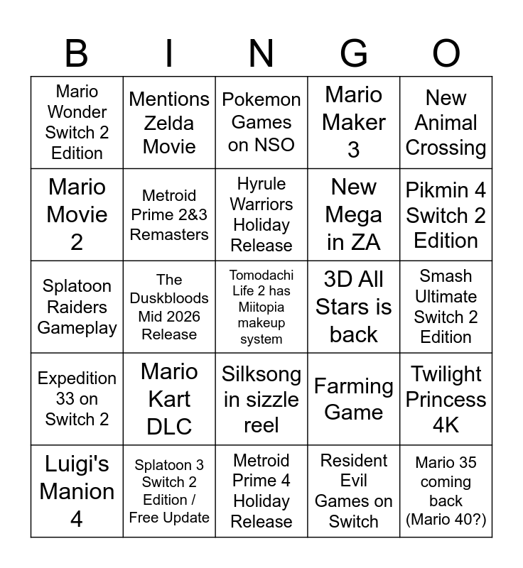 This bingo card has 25 words: Mario Kart DLC, Metroid Prime 4 Holiday Release, Hyrule Warriors Holiday Release, Luigi's Manion 4, New Animal Crossing, Mario Wonder Switch 2 Edition, Mario Movie 2, Mentions Zelda Movie, 3D All Stars is back, Silksong in sizzle reel, New Mega in ZA, Splatoon Raiders Gameplay, Farming Game, Twilight Princess 4K, Metroid Prime 2&3 Remasters, Mario 35 coming back (Mario 40?), Smash Ultimate Switch 2 Edition, Pokemon Games on NSO, Pikmin 4 Switch 2 Edition, The Duskbloods Mid 2026 Release, Tomodachi Life 2 has Miitopia makeup system, Splatoon 3 Switch 2 Edition / Free Update, Expedition 33 on Switch 2, Mario Maker 3 and Resident Evil Games on Switch.