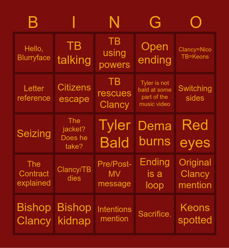 This bingo card has a free space and 24 words: Bishop Clancy, Clancy/TB dies, TB rescues Clancy, Sacrifice., Clancy=Nico TB=Keons, Hello, Blurryface, TB talking, TB using powers, Dema burns, Red eyes, Seizing, Citizens escape, Ending is a loop, Original Clancy mention, Letter reference, Bishop kidnap, Intentions mention, Open ending, Switching sides, The Contract explained, The jacket? Does he take?, Pre/Post-MV message, Tyler is not bald at some part of the music video and Keons spotted.