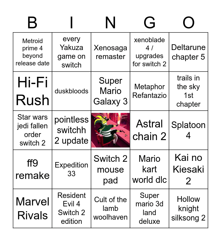 This bingo card has a free space and 24 words: Expedition 33, Resident Evil 4 Switch 2 edition, Super Mario Galaxy 3, Marvel Rivals, Deltarune chapter 5, Metroid prime 4 beyond release date, Hi-Fi Rush, every Yakuza game on switch, Astral chain 2, Switch 2 mouse pad, Metaphor Refantazio, Star wars jedi fallen order switch 2, Mario kart world dlc, Kai no Kiesaki 2, duskbloods, Super mario 3d land deluxe, Splatoon 4, Xenosaga remaster, trails in the sky 1st chapter, pointless switchh 2 update, Hollow knight silksong 2, ff9 remake, xenoblade 4 / upgrades for switch 2 and Cult of the lamb woolhaven.