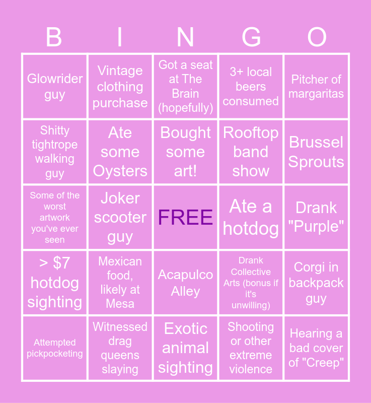 This bingo card has a free space and 31 words: Exotic animal sighting, Elvis guy, Joker scooter guy, Didgeridoo guy, Glowrider guy, Got a seat at The Brain (hopefully), Ate some Oysters, Drank Collective Arts (bonus if it's unwilling), Ate a hotdog, Shooting or other extreme violence, Drank "Purple", Hearing a bad cover of "Creep", Hotdog based art exhibit, Oyster/hot dog cart collab, Brussel Sprouts, Worlds best slice of cheese pizza, Corgi in backpack guy, Mexican food, likely at Mesa, > $7 hotdog sighting, Acapulco Alley, Pitcher of margaritas, Supported wholesome children selling their art, Attempted pickpocketing, Vintage clothing purchase, Rooftop band show, Shitty tightrope walking guy, 3+ local beers consumed, Some of the worst artwork you've ever seen, Witnessed drag queens slaying, Bought some art! and Local author selling conspiracy literature.
