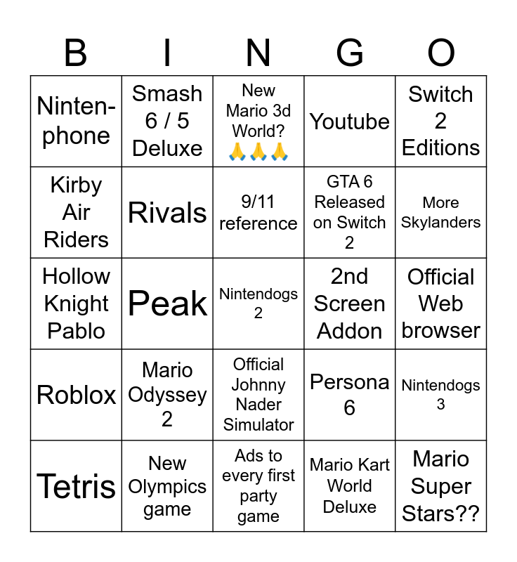This bingo card has a free space and 24 words: Mario Odyssey 2, New Olympics game, 9/11 reference, Tetris, Switch 2 Editions, Ninten-phone, Kirby Air Riders, Smash 6 / 5 Deluxe, 2nd Screen Addon, Official Johnny Nader Simulator, GTA 6 Released on Switch 2, Hollow Knight Pablo, Persona 6, Nintendogs 3, Rivals, Mario Kart World Deluxe, Official Web browser, New Mario 3d World? 🙏🙏🙏, More Skylanders, Peak, Mario Super Stars??, Roblox, Youtube and Ads to every first party game.
