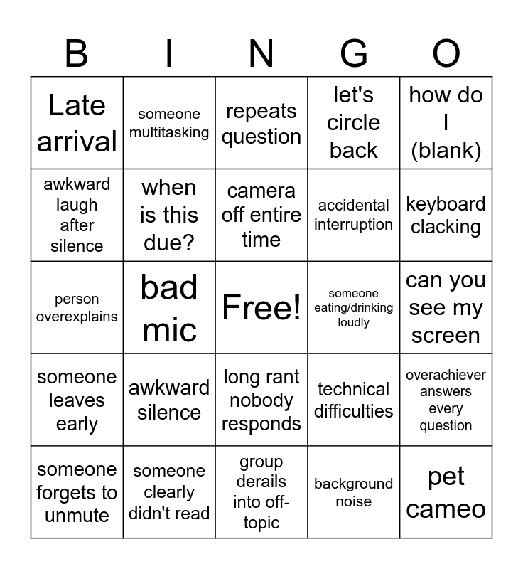 This bingo card has a free space and 24 words: someone forgets to unmute, awkward silence, camera off entire time, background noise, how do I (blank), Late arrival, someone multitasking, repeats question, someone eating/drinking loudly, can you see my screen, person overexplains, when is this due?, technical difficulties, overachiever answers every question, awkward laugh after silence, someone clearly didn't read, group derails into off-topic, let's circle back, keyboard clacking, someone leaves early, bad mic, long rant nobody responds, accidental interruption and pet cameo.
