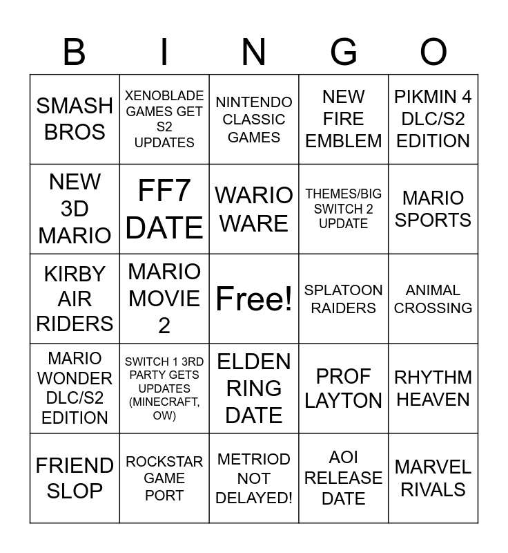 This bingo card has a free space and 30 words: ROCKSTAR GAME PORT, MARIO KART WORLD UPDATE, MARIO MOVIE 2, TOMODACHI LIFE 2, SMASH BROS, NINTENDO CLASSIC GAMES, FF7 DATE, ELDEN RING DATE, SPLATOON RAIDERS, METRIOD NOT DELAYED!, ANIMAL CROSSING, MARVEL RIVALS, AOI RELEASE DATE, DUSKBLOODS, MARIO SPORTS, POKEMON SPINOFF, PROF LAYTON, MARIO WONDER DLC/S2 EDITION, SWITCH 1 3RD PARTY GETS UPDATES (MINECRAFT, OW), PIKMIN 4 DLC/S2 EDITION, KIRBY AIR RIDERS, NEW AMIIBO, XENOBLADE GAMES GET S2 UPDATES, THEMES/BIG SWITCH 2 UPDATE, NEW 3D MARIO, NEW FIRE EMBLEM, RHYTHM HEAVEN, FRIEND SLOP, WARIO WARE and BETHESDA GAME PORT.