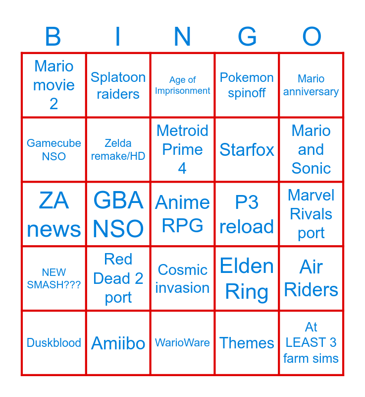 This bingo card has a free space and 24 words: Red Dead 2 port, Amiibo, Metroid Prime 4, Duskblood, Mario anniversary, Mario movie 2, Gamecube NSO, Splatoon raiders, P3 reload, Cosmic invasion, Starfox, ZA news, Elden Ring, Air Riders, Zelda remake/HD, Themes, Marvel Rivals port, Age of Imprisonment, Mario and Sonic, GBA NSO, At LEAST 3 farm sims, NEW SMASH???, Pokemon spinoff and WarioWare.