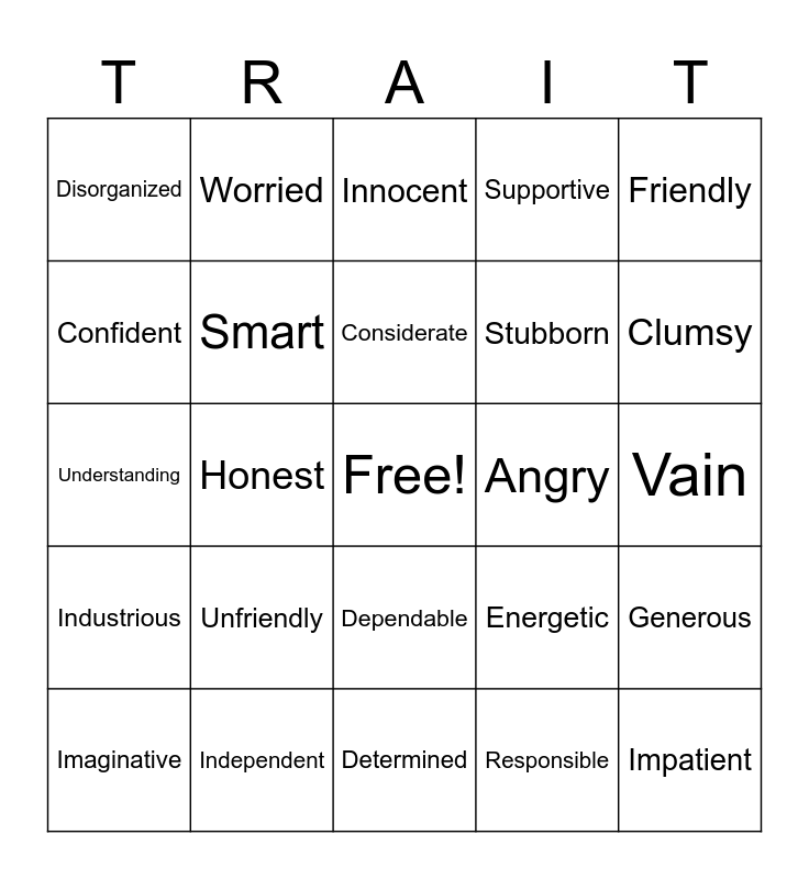 This bingo card has a free space and 96 words: Adventurous, Affectionate, Ambitious, Angry, Anxious, Arrogant, Artistic, Brave, Bossy, Calm, Caring, Cheerful, Clever, Clumsy, Compassionate, Confident, Considerate, Courteous, Cowardly, Creative, Curious, Cynical, Daring, Decisive, Dependable, Determined, Diligent, Disorganized, Dishonest, Dramatic, Easygoing, Energetic, Enthusiastic, Fearful, Friendly, Funny, Generous, Gentle, Grumpy, Honest, Humble, Imaginative, Impatient, Independent, Industrious, Innocent, Intelligent, Jealous, Joyful, Kind, Lazy, Loyal, Mean, Moody, Naive, Neat, Nervous, Observant, Optimistic, Outgoing, Patient, Persistent, Pessimistic, Playful, Polite, Practical, Quiet, Reliable, Respectful, Responsible, Rude, Selfish, Sensitive, Serious, Shy, Silly, Sincere, Smart, Sneaky, Stubborn, Supportive, Sweet, Talented, Thoughtful, Trustworthy, Understanding, Unfriendly, Unreliable, Unselfish, Vain, Versatile, Warm, Witty, Wise, Worried and Zealous.