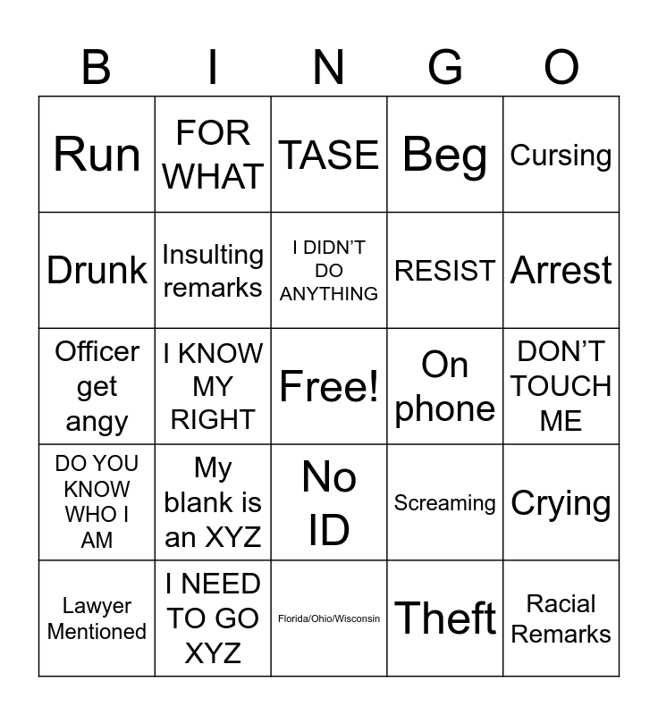 This bingo card has a free space and 24 words: My blank is an XYZ, I NEED TO GO XYZ, I DIDN’T DO ANYTHING, Lawyer Mentioned, Cursing, Run, Drunk, FOR WHAT, On phone, No ID, RESIST, Officer get angy, Screaming, Crying, Insulting remarks, Theft, DON’T TOUCH ME, TASE, Arrest, I KNOW MY RIGHT, Racial Remarks, DO YOU KNOW WHO I AM, Beg and Florida/Ohio/Wisconsin.