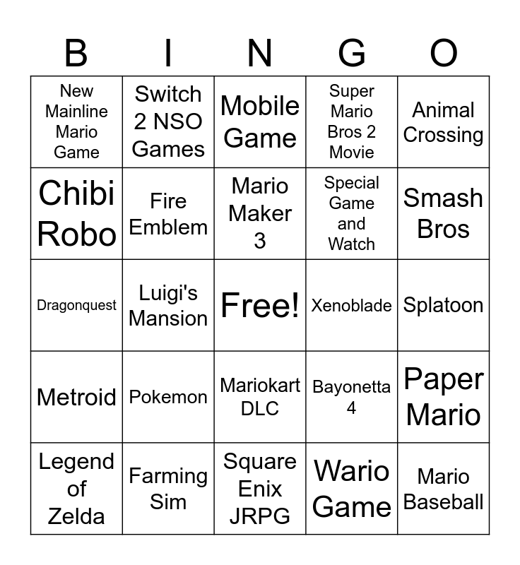 This bingo card has a free space and 24 words: Pokemon, Farming Sim, Mario Maker 3, Legend of Zelda, Animal Crossing, New Mainline Mario Game, Chibi Robo, Switch 2 NSO Games, Xenoblade, Mariokart DLC, Special Game and Watch, Dragonquest, Bayonetta 4, Paper Mario, Fire Emblem, Wario Game, Splatoon, Mobile Game, Smash Bros, Luigi's Mansion, Mario Baseball, Metroid, Super Mario Bros 2 Movie and Square Enix JRPG.