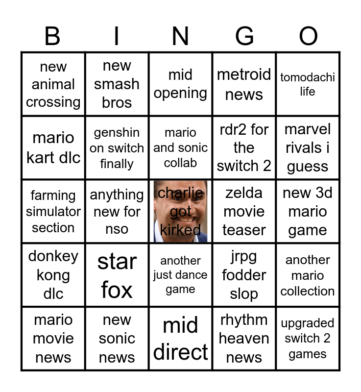 This bingo card has a free space and 24 words: star fox, new sonic news, mario and sonic collab, mario movie news, tomodachi life, new animal crossing, mario kart dlc, new smash bros, zelda movie teaser, another just dance game, rdr2 for the switch 2, farming simulator section, jrpg fodder slop, another mario collection, genshin on switch finally, rhythm heaven news, new 3d mario game, mid opening, marvel rivals i guess, anything new for nso, upgraded switch 2 games, donkey kong dlc, metroid news and mid direct.