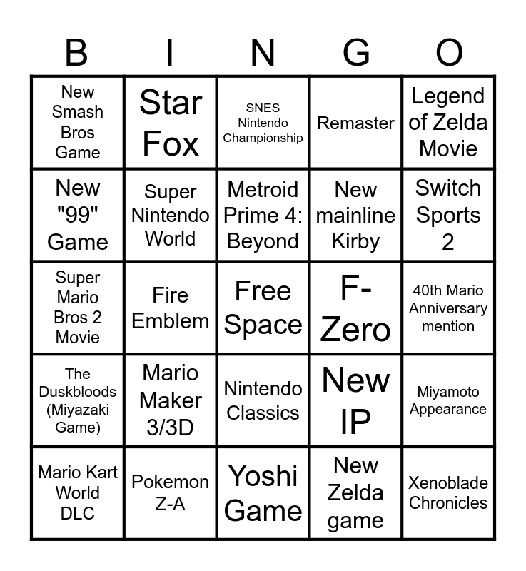 This bingo card has a free space and 24 words: Mario Maker 3/3D, Pokemon Z-A, Metroid Prime 4: Beyond, Mario Kart World DLC, Legend of Zelda Movie, New Smash Bros Game, New "99" Game, Star Fox, F-Zero, Nintendo Classics, New mainline Kirby, Super Mario Bros 2 Movie, New IP, Miyamoto Appearance, Super Nintendo World, New Zelda game, 40th Mario Anniversary mention, SNES Nintendo Championship, Switch Sports 2, Fire Emblem, Xenoblade Chronicles, The Duskbloods (Miyazaki Game), Remaster and Yoshi Game.
