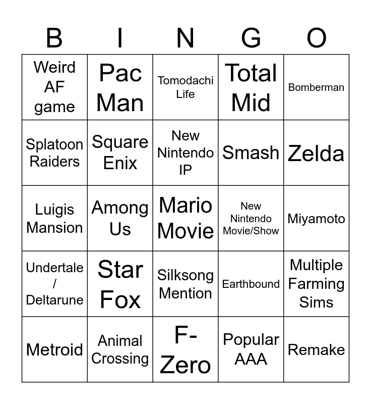 This bingo card has a free space and 49 words: Mario Game, Remake, UNEXPECTED BANGER, F-Zero, Star Fox, Game and Watch, Pac Man, Fortnite, Splatoon Raiders, Ace Attorney, Square Enix, Total Mid, Multiple Farming Sims, Earthbound, Pikmin, Super Nintendo World, New Nintendo IP, New Nintendo Movie/Show, Lego, Bomberman, Among Us, Popular AAA, Weird AF game, Smash, Kirby, Zelda, Metroid, Indie Legend, Silksong Mention, Undertale / Deltarune, Mobile App/Game, Sonic Racing, Persona, Odyssey 2, Animal Crossing, Chibi Robo, Boxboy, NSO Classic, Miyamoto, Punch Out, Final Fantasy, Xenoblade, Fire Emblem, Mario Maker, Luigis Mansion, Tomodachi Life, Rhythm Heaven, Pokemon and Valve.