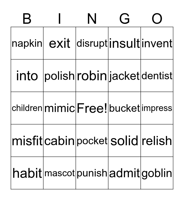 This bingo card has a free space and 24 words: cabin, mascot, robin, habit, invent, napkin, into, exit, bucket, pocket, jacket, children, solid, relish, polish, admit, impress, disrupt, dentist, mimic, goblin, misfit, insult and punish.
