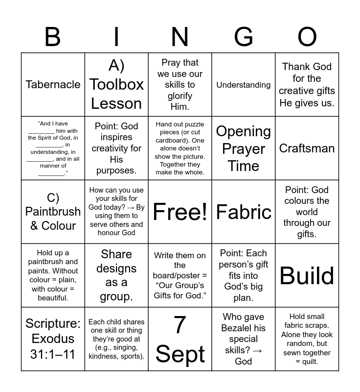 This bingo card has a free space and 94 words: SEPTEMBER 2025 – Theme: God’s Gifts in Us, Date, 7 Sept, 14 Sept, 21 Sept, 28 Sept, Sunday 14 September 2025 – Bezalel the Craftsman, Scripture: Exodus 31:1–11, Theme: God gives creativity and skills for His work., Welcome & Introduction (5 mins), Kia ora tamariki mā! Last week we heard about the Parable of the Talents, which showed us that God wants us to use what He has given us. Today we’ll hear about a man named Bezalel, whom God filled with His Spirit to design and build the Tabernacl, Christian Connection (Synopsis), Bezalel wasn’t a prophet or preacher — he was a craftsman. Yet God’s Spirit gave him special skill in working with gold, silver, wood, and fabric. This reminds us that every gift matters: art, music, building, helping, speaking — all can glorify, Opening Prayer Time, Small group prayer suggestions:, Thank God for the creative gifts He gives us., Pray that we use our skills to glorify Him., Ask God to help us notice others’ talents and celebrate them., Icebreaker Game: “Gift Charades”, Kids act out a gift (drawing, singing, helping, praying, baking, sports) while others guess., Point: God’s gifts come in many forms, and all can be used to serve Him., Interactive Activities (choose 1–2), 1) Design Challenge (Quiet & Seated), Give paper and crayons. Children draw something beautiful they’d make for God’s house., Share designs as a group., Point: God inspires creativity for His purposes., 2) Build It Together, Use blocks, Lego, or scrap paper to build a simple “tabernacle” or tower together., Point: God gave Bezalel gifts, but he also worked with others., 3) Skill Swap, Each child shares one skill or thing they’re good at (e.g., singing, kindness, sports)., Write them on the board/poster = “Our Group’s Gifts for God.”, Point: Every gift counts in God’s family., Object Lessons (choose 1–2), A) Toolbox Lesson, Show a toolbox (or picture). Each tool has a different job., Point: Like tools, God gives each of us different gifts., B) Puzzle Pieces, Hand out puzzle pieces (or cut cardboard). One alone doesn’t show the picture. Together they make the whole., Point: Each person’s gift fits into God’s big plan., C) Paintbrush & Colour, Hold up a paintbrush and paints. Without colour = plain, with colour = beautiful., Point: God colours the world through our gifts., D) Fabric Patchwork, Hold small fabric scraps. Alone they look random, but sewn together = quilt., Point: Our gifts may seem small, but together they create something beautiful., Bible Story & Video, 📖 Read Exodus 31:1–11 aloud., 📺 Video suggestion: God Chooses Bezalel – Bible Story for Kids, (approx 4 mins), Quiz Questions (with Answers), Who gave Bezalel his special skills? → God, What was Bezalel asked to help build? → The Tabernacle, What materials could Bezalel work with? → Gold, silver, bronze, wood, fabric, Who helped Bezalel with the work? → Oholiab, What kind of gift did God give Bezalel? → Creativity and craftsmanship, Did God’s Spirit fill Bezalel for this task? → Yes, Why was the Tabernacle important? → It was where God’s people worshipped Him, What does Bezalel’s story show us about “ordinary” skills? → They matter to God, Can creativity be a spiritual gift? → Yes, How can you use your skills for God today? → By using them to serve others and honour God, AI Image Prompt (Colouring Page), A black and white line drawing for children aged 6–12 with bold outlines. Bezalel is shown working on the Tabernacle: carving wood or shaping gold. Tools, fabric, and materials are nearby. Oholiab is beside him helping. The style is simple, joyfu, Devotional Scripture, Exodus 31:3, NKJV: “And I have filled him with the Spirit of God, in wisdom, in understanding, in knowledge, and in all manner of workmanship.”, NIV: “And I have filled him with the Spirit of God, with wisdom, with understanding, with knowledge and with all kinds of skills.”, Fill-in-the-Blanks (NKJV):, “And I have ________ him with the Spirit of God, in ________, in understanding, in ________, and in all manner of ________.”, Word Find (24 Words), Bezalel, Oholiab, Spirit, Wisdom, Understanding, Knowledge, Skill, Craftsman, Build, Gold, Silver, Bronze, Wood, Fabric, Tabernacle, Tools, Work, Create, Gift, Design, Serve, Talent, Beautiful and Glory.