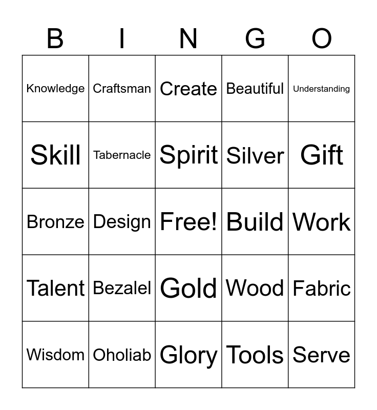 This bingo card has a free space and 24 words: Bezalel, Oholiab, Spirit, Wisdom, Understanding, Knowledge, Skill, Craftsman, Build, Gold, Silver, Bronze, Wood, Fabric, Tabernacle, Tools, Work, Create, Gift, Design, Serve, Talent, Beautiful and Glory.