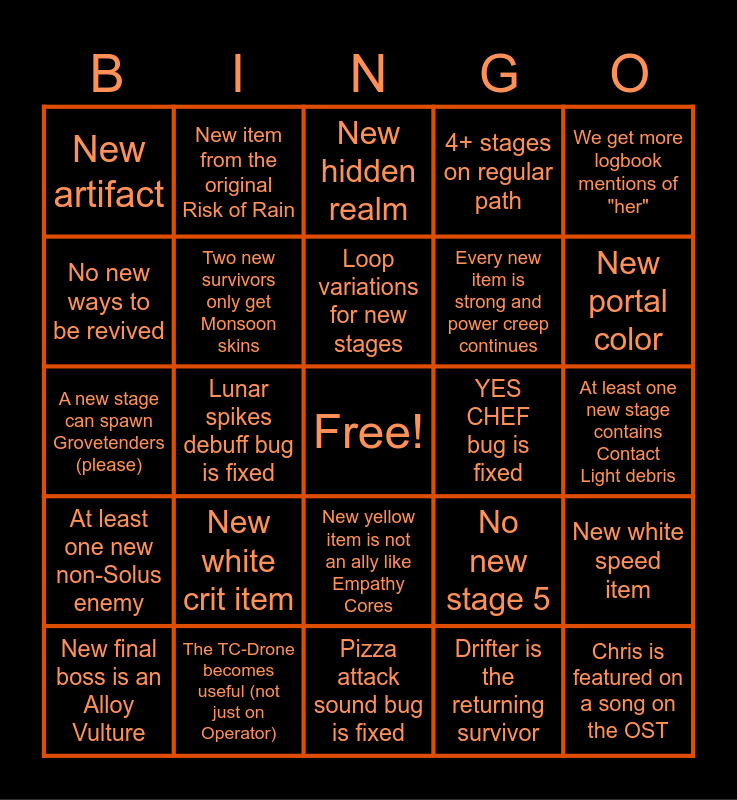 This bingo card has a free space and 24 words: New final boss is an Alloy Vulture, New white crit item, Loop variations for new stages, Drifter is the returning survivor, We get more logbook mentions of "her", New artifact, New item from the original Risk of Rain, New hidden realm, YES CHEF bug is fixed, At least one new stage contains Contact Light debris, A new stage can spawn Grovetenders (please), Two new survivors only get Monsoon skins, No new stage 5, New white speed item, No new ways to be revived, The TC-Drone becomes useful (not just on Operator), Pizza attack sound bug is fixed, 4+ stages on regular path, New portal color, At least one new non-Solus enemy, Lunar spikes debuff bug is fixed, New yellow item is not an ally like Empathy Cores, Every new item is strong and power creep continues and Chris is featured on a song on the OST.
