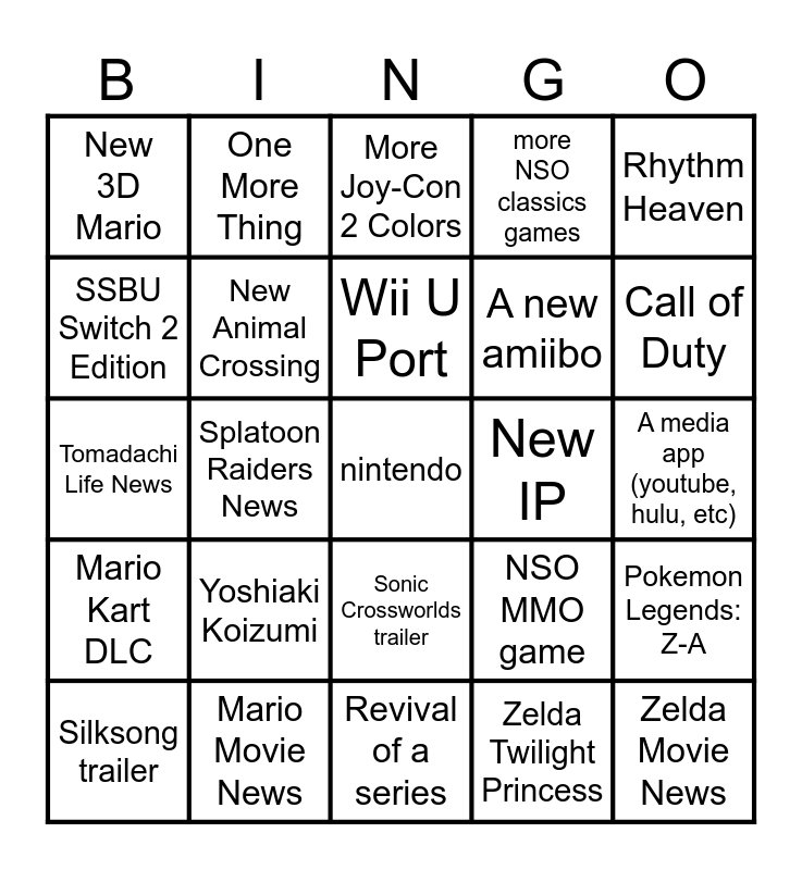 This bingo card has a free space and 24 words: Yoshiaki Koizumi, Mario Movie News, Wii U Port, Silksong trailer, Rhythm Heaven, New 3D Mario, SSBU Switch 2 Edition, One More Thing, New IP, Sonic Crossworlds trailer, A new amiibo, Tomadachi Life News, NSO MMO game, Pokemon Legends: Z-A, New Animal Crossing, Zelda Twilight Princess, A media app (youtube, hulu, etc), More Joy-Con 2 Colors, Call of Duty, Splatoon Raiders News, Zelda Movie News, Mario Kart DLC, more NSO classics games and Revival of a series.