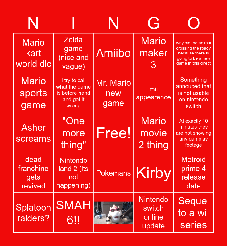 This bingo card has 1 images, a free space and 23 words: Nintendo land 2 (its not happening), SMAH 6!!, Mr. Mario new game, Splatoon raiders?, why did the animal crossing the road? because there is going to be a new game in this direct, Mario kart world dlc, Mario sports game, Zelda game (nice and vague), Mario movie 2 thing, Pokemans, mii appearence, Asher screams, Kirby, Metroid prime 4 release date, I try to call what the game is before hand and get it wrong, Nintendo switch online update, At exactly 10 minutes they are not showing any gamplay footage, Amiibo, Something annouced that is not usable on nintendo switch, "One more thing", Sequel to a wii series, dead franchine gets revived and Mario maker 3.