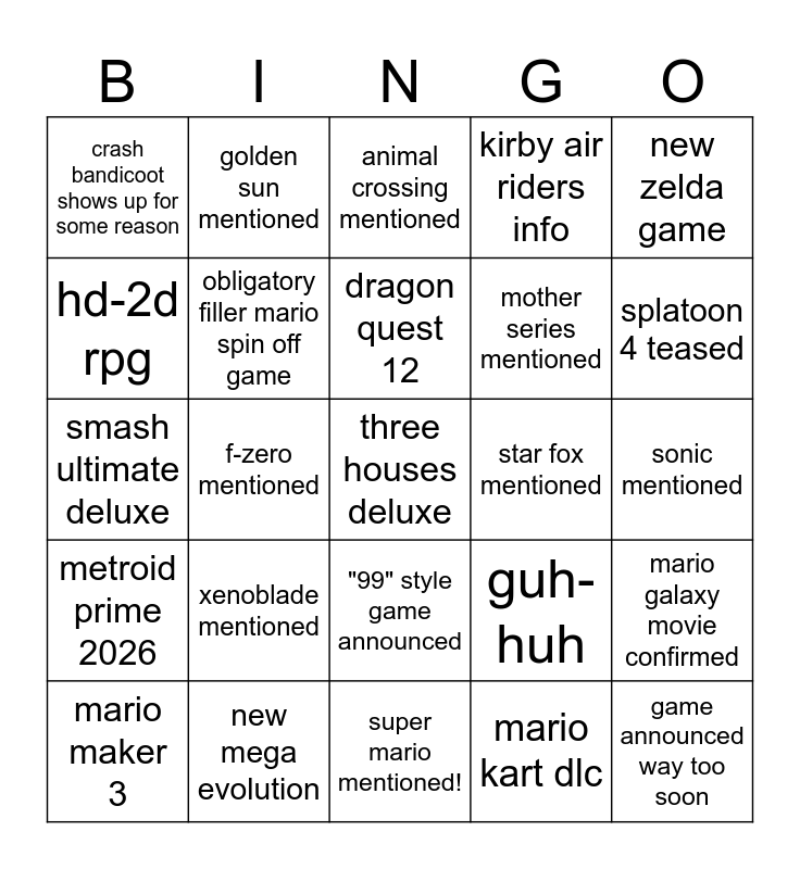 This bingo card has 25 words: metroid prime 2026, new mega evolution, three houses deluxe, mario kart dlc, new zelda game, crash bandicoot shows up for some reason, golden sun mentioned, animal crossing mentioned, star fox mentioned, mario galaxy movie confirmed, hd-2d rpg, obligatory filler mario spin off game, super mario mentioned!, guh-huh, splatoon 4 teased, mario maker 3, f-zero mentioned, dragon quest 12, mother series mentioned, sonic mentioned, smash ultimate deluxe, xenoblade mentioned, "99" style game announced, kirby air riders info and game announced way too soon.