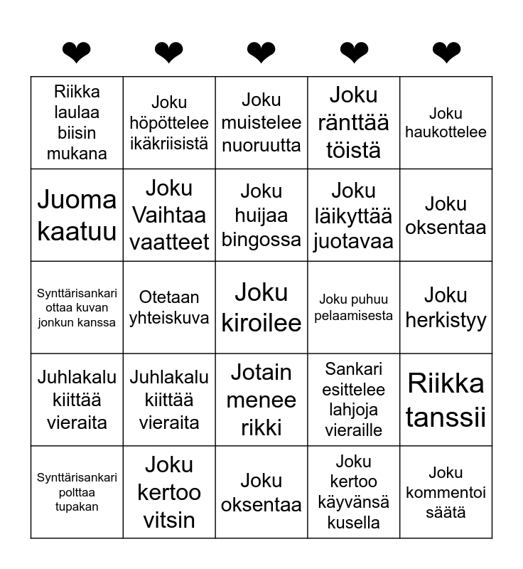 This bingo card has a free space and 24 words: Juhlakalu kiittää vieraita, Joku kertoo vitsin, Joku huijaa bingossa, Synttärisankari polttaa tupakan, Joku haukottelee, Riikka laulaa biisin mukana, Juoma kaatuu, Joku höpöttelee ikäkriisistä, Joku puhuu pelaamisesta, Jotain menee rikki, Joku läikyttää juotavaa, Synttärisankari ottaa kuvan jonkun kanssa, Sankari esittelee lahjoja vieraille, Riikka tanssii, Joku Vaihtaa vaatteet, Joku kertoo käyvänsä kusella, Joku herkistyy, Joku muistelee nuoruutta, Joku oksentaa, Otetaan yhteiskuva, Joku kommentoi säätä, Juhlakalu kiittää vieraita, Joku ränttää töistä and Joku oksentaa.