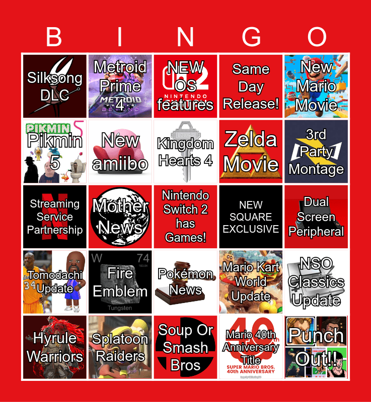 This bingo card has 22 images, a free space and 24 words: Fire Emblem, Splatoon Raiders, Kingdom Hearts 4, Hyrule Warriors, New Mario Movie, Silksong DLC, Pikmin 5, Metroid Prime 4, NEW SQUARE EXCLUSIVE, Pokémon News, Zelda Movie, Streaming Service Partnership, Mario Kart World Update, NSO Classics Update, New amiibo, Mario 40th Anniversary Title, Dual Screen Peripheral, NEW OS features, 3rd Party Montage, Mother News, Punch Out!!, Tomodachi Update, Same Day Release! and Soup Or Smash Bros.