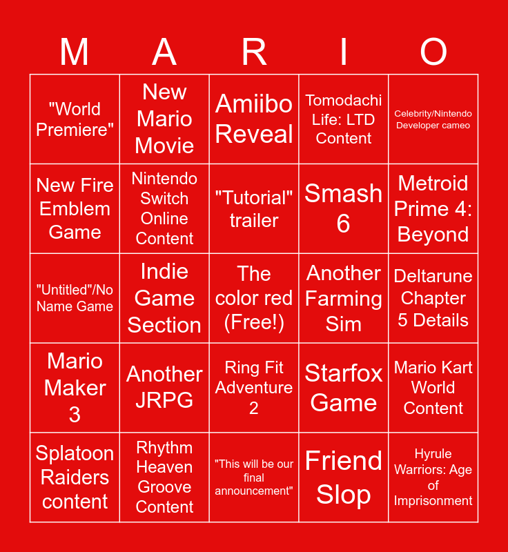 This bingo card has a free space and 24 words: Splatoon Raiders content, Another JRPG, "Tutorial" trailer, Friend Slop, Celebrity/Nintendo Developer cameo, "World Premiere", New Mario Movie, Amiibo Reveal, Another Farming Sim, Deltarune Chapter 5 Details, "Untitled"/No Name Game, Nintendo Switch Online Content, Starfox Game, Mario Kart World Content, New Fire Emblem Game, Rhythm Heaven Groove Content, "This will be our final announcement", Tomodachi Life: LTD Content, Metroid Prime 4: Beyond, Mario Maker 3, Indie Game Section, Ring Fit Adventure 2, Smash 6 and Hyrule Warriors: Age of Imprisonment.