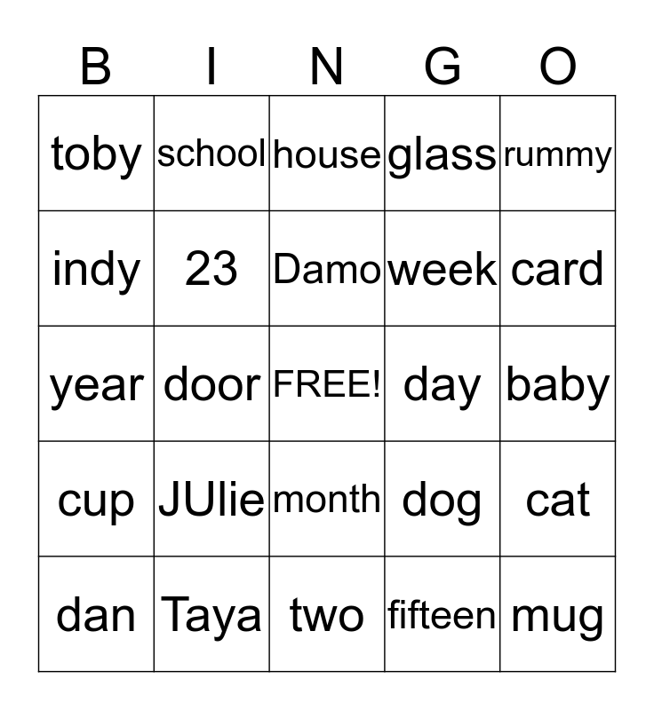 This bingo card has a free space and 24 words: JUlie, Taya, Damo, dan, rummy, toby, indy, school, day, month, week, year, dog, cat, 23, fifteen, baby, house, card, door, mug, cup, glass and two.