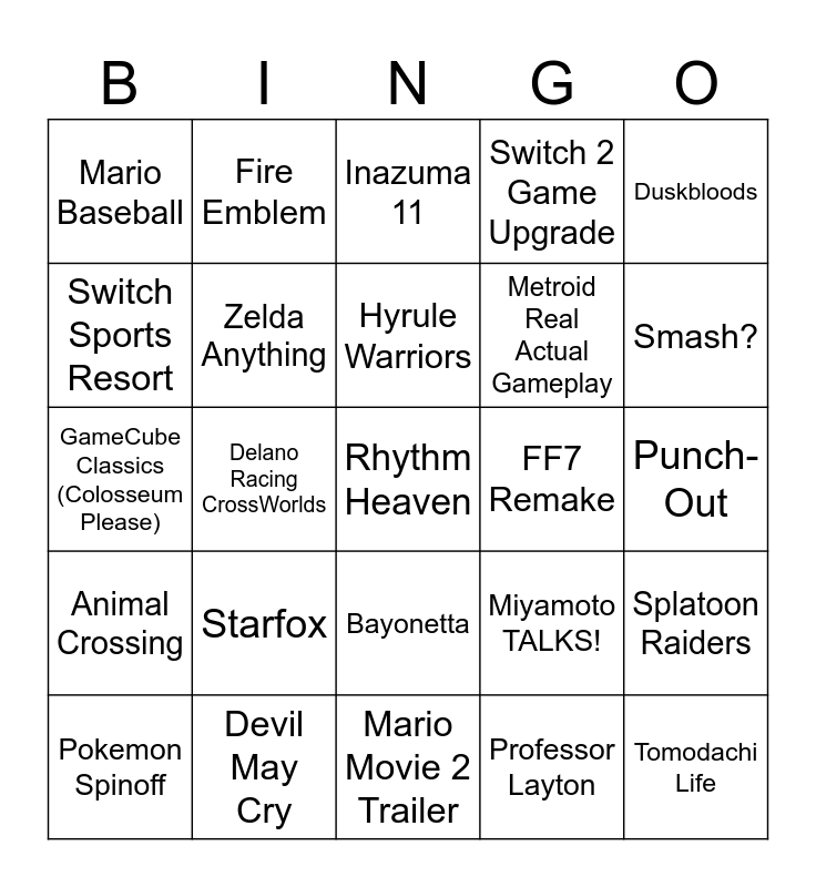 This bingo card has 25 words: Starfox, Mario Movie 2 Trailer, Hyrule Warriors, Pokemon Spinoff, Duskbloods, Mario Baseball, Switch Sports Resort, Fire Emblem, FF7 Remake, Bayonetta, Metroid Real Actual Gameplay, GameCube Classics (Colosseum Please), Miyamoto TALKS!, Splatoon Raiders, Zelda Anything, Tomodachi Life, Punch-Out, Inazuma 11, Smash?, Delano Racing CrossWorlds, Rhythm Heaven, Devil May Cry, Animal Crossing, Switch 2 Game Upgrade and Professor Layton.