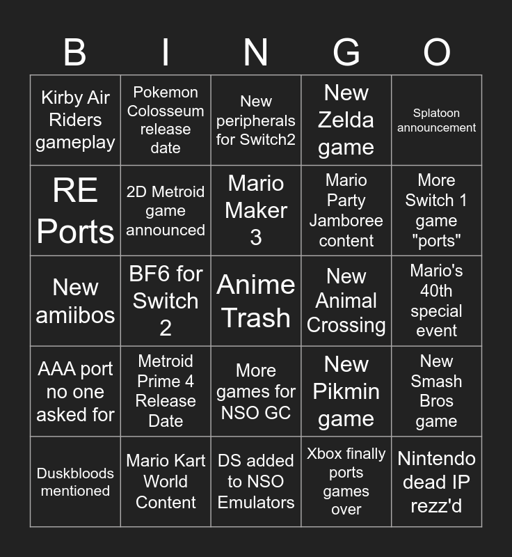 This bingo card has a free space and 24 words: Metroid Prime 4 Release Date, Mario Kart World Content, Mario Maker 3, Duskbloods mentioned, Splatoon announcement, Kirby Air Riders gameplay, RE Ports, Pokemon Colosseum release date, New Animal Crossing, More games for NSO GC, Mario Party Jamboree content, New amiibos, New Pikmin game, New Smash Bros game, 2D Metroid game announced, Xbox finally ports games over, Mario's 40th special event, New peripherals for Switch2, More Switch 1 game "ports", BF6 for Switch 2, Nintendo dead IP rezz'd, AAA port no one asked for, New Zelda game and DS added to NSO Emulators.