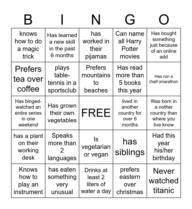 This bingo card has a free space and 24 words: Speaks more than 2 languages, has eaten something very unusual, Prefers mountains to beaches, Knows how to play an instrument, Has bought something just because of an online add, knows how to do a magic trick, Prefers tea over coffee, Has learned a new skill in the past 6 months, lived in another country for over 6 months, Is vegetarian or vegan, Has read more than 5 books this year, Has binged-watched an entire series in one weekend, has siblings, Had this year his/her birthday, plays table-tennis in a sportsclub, prefers eastern over christmas, Was born in a nother country than where you live know, has worked in their pijamas, Has run a (half-)marathon, Has grown their own vegetables, Never watched titanic, has a plant on their working desk, Can name all Harry Potter movies and Drinks at least 2 liters of water a day.