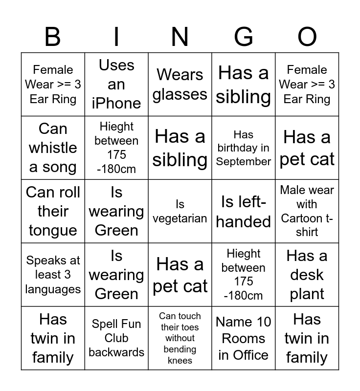 ⚠ This card has duplicate items: Has birthday in September (3), Wears glasses (3), Has a pet cat (3), Speaks at least 3 languages (3), Is left-handed (3), Joined the company for >= 3years (3), Can whistle a song (3), Is wearing Green (3), Has a desk plant (3), Staff pass >= $10 (3), Name 10 Rooms in Office (3), Female Wear >= 3 Ear Ring (3), Name >= 5 durians species (3), Male wear with Cartoon t-shirt (3), Wear branded watch (3), Has a sibling (3), Is vegetarian (3), Has a tattoo (3), Hieght between 175 -180cm (3), Can wiggle their ears (3), Can raise 1 eyebrow (3), Has twin in family (3), Can touch their toes without bending knees (3), Uses an iPhone (3), Can roll their tongue (3), Spell Fun Club backwards (3), Has broken their phone screen (3), Is wearing Orange (3), is wearing contact len (3), Wear YSQ T-shirt (3)