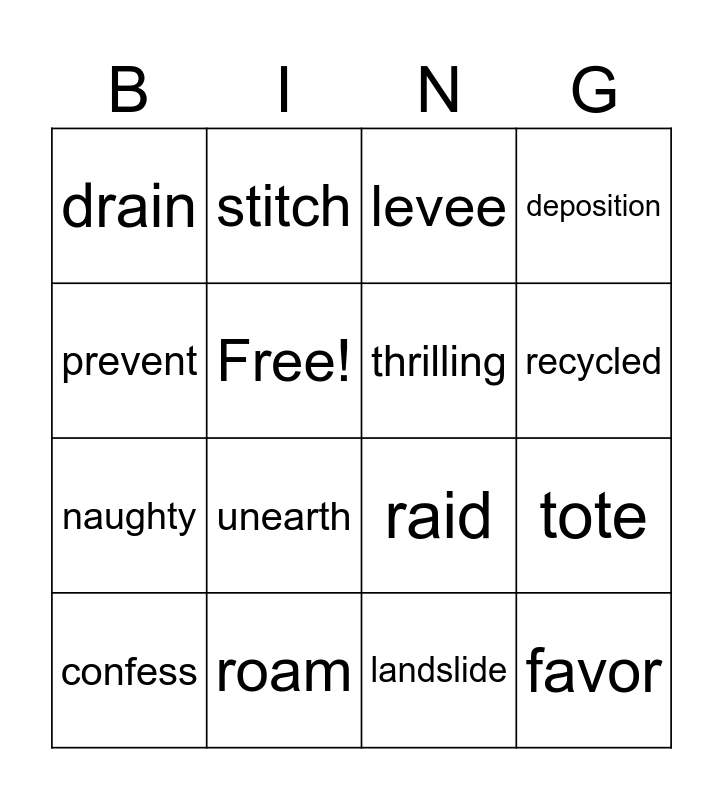 This bingo card has 16 words: roam, tote, levee, drain, naughty, stitch, raid, landslide, prevent, Free!, confess, deposition, unearth, recycled, thrilling and favor.