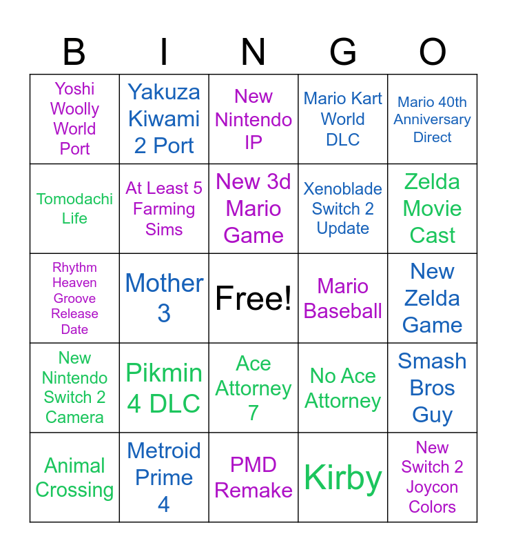 This bingo card has a free space and 24 words: Pikmin 4 DLC, Metroid Prime 4, New 3d Mario Game, Animal Crossing, Mario 40th Anniversary Direct, Yoshi Woolly World Port, Tomodachi Life, Yakuza Kiwami 2 Port, Mario Baseball, Ace Attorney 7, Xenoblade Switch 2 Update, Rhythm Heaven Groove Release Date, No Ace Attorney, Smash Bros Guy, At Least 5 Farming Sims, Kirby, New Zelda Game, New Nintendo IP, Zelda Movie Cast, Mother 3, New Switch 2 Joycon Colors, New Nintendo Switch 2 Camera, Mario Kart World DLC and PMD Remake.