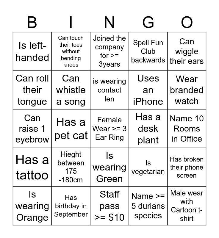 This bingo card has 30 words: Has birthday in September, Wears glasses, Has a pet cat, Speaks at least 3 languages, Is left-handed, Joined the company for >= 3years, Can whistle a song, Is wearing Green, Has a desk plant, Staff pass >= $10, Name 10 Rooms in Office, Female Wear >= 3 Ear Ring, Name >= 5 durians species, Male wear with Cartoon t-shirt, Wear branded watch, Has a sibling, Is vegetarian, Has a tattoo, Hieght between 175 -180cm, Can wiggle their ears, Can raise 1 eyebrow, Has twin in family, Can touch their toes without bending knees, Uses an iPhone, Can roll their tongue, Spell Fun Club backwards, Has broken their phone screen, Is wearing Orange, is wearing contact len and Wear YSQ T-shirt.