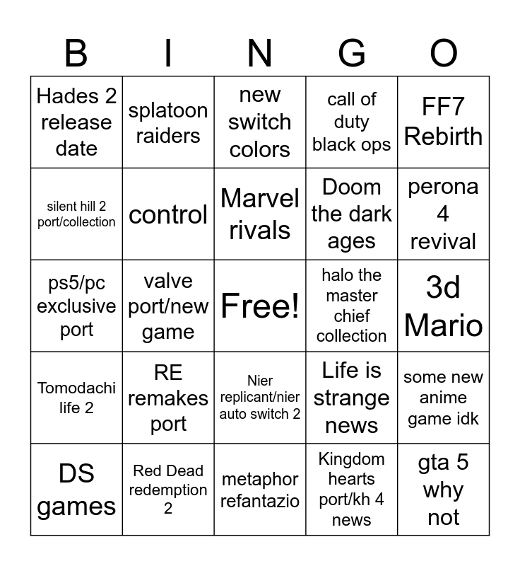 This bingo card has a free space and 24 words: RE remakes port, Red Dead redemption 2, Marvel rivals, DS games, FF7 Rebirth, Hades 2 release date, silent hill 2 port/collection, splatoon raiders, halo the master chief collection, Nier replicant/nier auto switch 2, Doom the dark ages, ps5/pc exclusive port, Life is strange news, some new anime game idk, control, Kingdom hearts port/kh 4 news, 3d Mario, new switch colors, perona 4 revival, valve port/new game, gta 5 why not, Tomodachi life 2, call of duty black ops and metaphor refantazio.