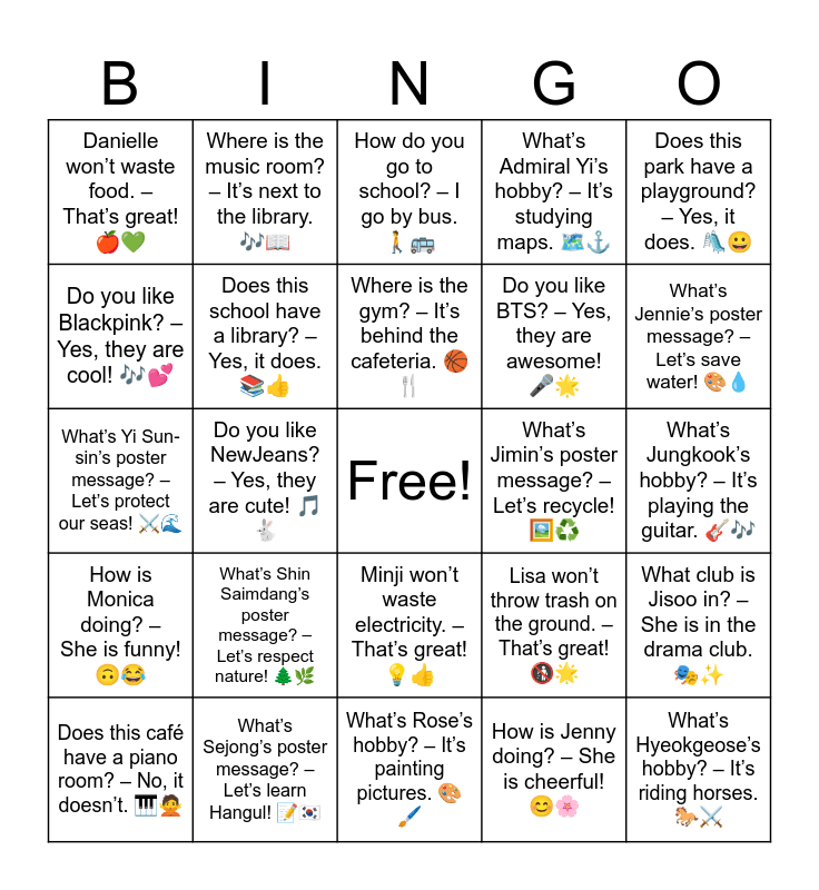 This bingo card has a free space and 34 words: What grade are you in? β Iβm in the sixth grade! ππ, How is Jenny doing? β She is cheerful! ππΈ, How is Hailey doing? β She is confident! ππ, How is Angela doing? β She is kind! π€π, How is Monica doing? β She is funny! ππ, Does this school have a library? β Yes, it does. ππ, Does this park have a playground? β Yes, it does. ππ, Does this cafΓ© have a piano room? β No, it doesnβt. πΉπ , Where is the music room? β Itβs next to the library. πΆπ, Where is the science lab? β Itβs on the third floor. π¬π«, Where is the gym? β Itβs behind the cafeteria. ππ΄, How do you go to school? β I go by bus. πΆπ, How do you go to the park? β I go by bike. π³π², How do you go to Seoul? β I go by train. ποΈπ, Whatβs Jiminβs poster message? β Letβs recycle! πΌοΈβ»οΈ, Whatβs Jennieβs poster message? β Letβs save water! π¨π§, Whatβs Sejongβs poster message? β Letβs learn Hangul! ππ°π·, Whatβs Yi Sun-sinβs poster message? β Letβs protect our seas! βοΈπ, Whatβs Shin Saimdangβs poster message? β Letβs respect nature! π²πΏ, Lisa wonβt throw trash on the ground. β Thatβs great! π―π, Minji wonβt waste electricity. β Thatβs great! π‘π, Hanni wonβt use plastic bags. β Thatβs great! ποΈπ, Danielle wonβt waste food. β Thatβs great! ππ, Whatβs Jungkookβs hobby? β Itβs playing the guitar. πΈπΆ, Whatβs Roseβs hobby? β Itβs painting pictures. π¨ποΈ, Whatβs Hyeokgeoseβs hobby? β Itβs riding horses. πβοΈ, Whatβs Admiral Yiβs hobby? β Itβs studying maps. πΊοΈβ, Whatβs Shin Saimdangβs hobby? β Itβs calligraphy. ποΈπ, Do you like BTS? β Yes, they are awesome! π€π, Do you like Blackpink? β Yes, they are cool! πΆπ, Do you like Stray Kids? β Yes, they are amazing! π§π₯, Do you like NewJeans? β Yes, they are cute! π΅π, What club is Jisoo in? β She is in the drama club. πβ¨ and What club is King Sejong in? β He is in the writing club. βοΈπ.