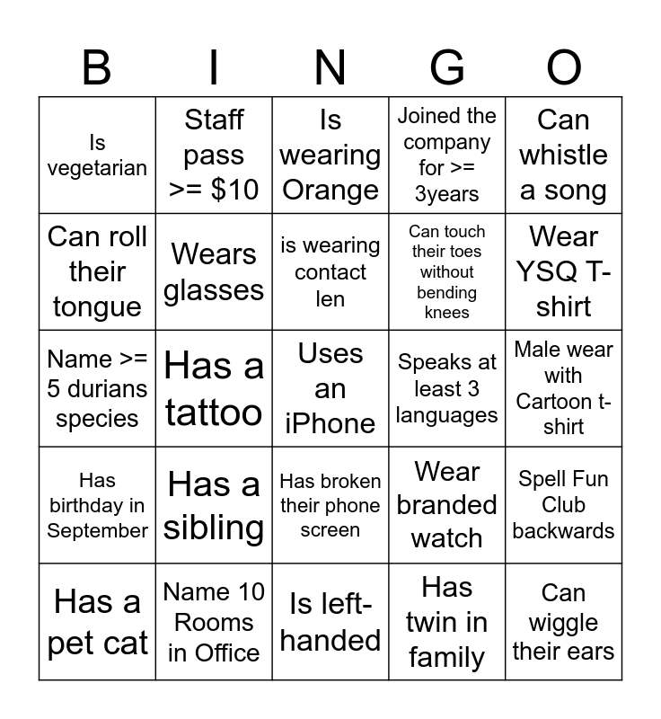 This bingo card has 30 words: Name 10 Rooms in Office, Has a desk plant, Has a tattoo, Can raise 1 eyebrow, Is vegetarian, Is wearing Orange, Wears glasses, Has broken their phone screen, Speaks at least 3 languages, Is left-handed, Male wear with Cartoon t-shirt, Uses an iPhone, Has twin in family, Can wiggle their ears, Wear YSQ T-shirt, Female Wear >= 3 Ear Ring, Wear branded watch, Has birthday in September, Has a sibling, Can whistle a song, Name >= 5 durians species, Hieght between 175 -180cm, Staff pass >= $10, Can touch their toes without bending knees, Can roll their tongue, Joined the company for >= 3years, Spell Fun Club backwards, Has a pet cat, is wearing contact len and Is wearing Green.