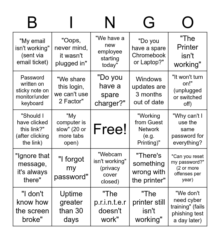 This bingo card has a free space and 24 words: "I forgot my password", Uptime greater than 30 days, "Do you have a spare charger?", "I don't know how the screen broke", "The Printer isn't working", "My email isn't working" (sent via email ticket), Password written on sticky note on monitor/under keyboard, "Oops, never mind, it wasn't plugged in", "Working from Guest Network (e.g. Printing)", "Webcam isn't working" (privacy cover closed), Windows updates are 3 months out of date, "Should I have clicked this link?" (after clicking the link), "There's something wrong with the printer", "Can you reset my password?" (2 or more offenses per year), "We share this login, we can't use 2 Factor", "The printer still isn't working", "Why can't I use the same password for everything?, "We have a new employee starting today", "It won't turn on!" (unplugged or switched off), "My computer is slow" (20 or more tabs open), "We don't need cyber training" (fails phishing test a day later), "Ignore that message, it's always there", "Do you have a spare Chromebook or Laptop?" and "The p.r.i.n.t.e.r doesn't work".