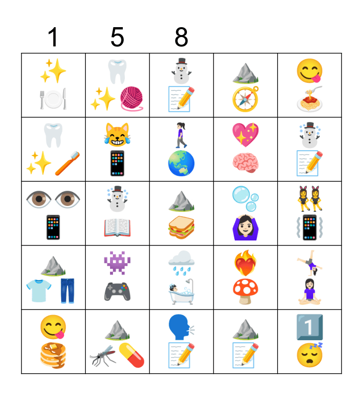 This bingo card has 25 words: ๐พ๐ฎ, ๐ฃ๏ธ๐, ๐ถ๐ปโโ๏ธ๐, ๐๐ฅ, ๐๐, โจ๐ฝ๏ธ, ๐ฆท โจ๐ชฅ, ๐ฆท โจ๐งถ, ๐ซง๐๐ปโโ๏ธ, ๐ง๏ธ๐๐ป, ๐๐ง , ๐๏ธ๐๏ธ๐ฑ, โค๏ธโ๐ฅ๐, ๐คธ๐ปโโ๏ธ๐ง๐ปโโ๏ธ, ๐น๐ฑ, 1๏ธโฃ๐ด, ๐ฏโโ๏ธ ๐ณ, โ๐, โ๏ธ๐, โ๏ธ๐, โฐ๏ธ๐ฅช, โฐ๏ธ ๐ฆ๐, โฐ๏ธ ๐๐, โฐ๏ธ๐งญ and โฐ๏ธ๐.
