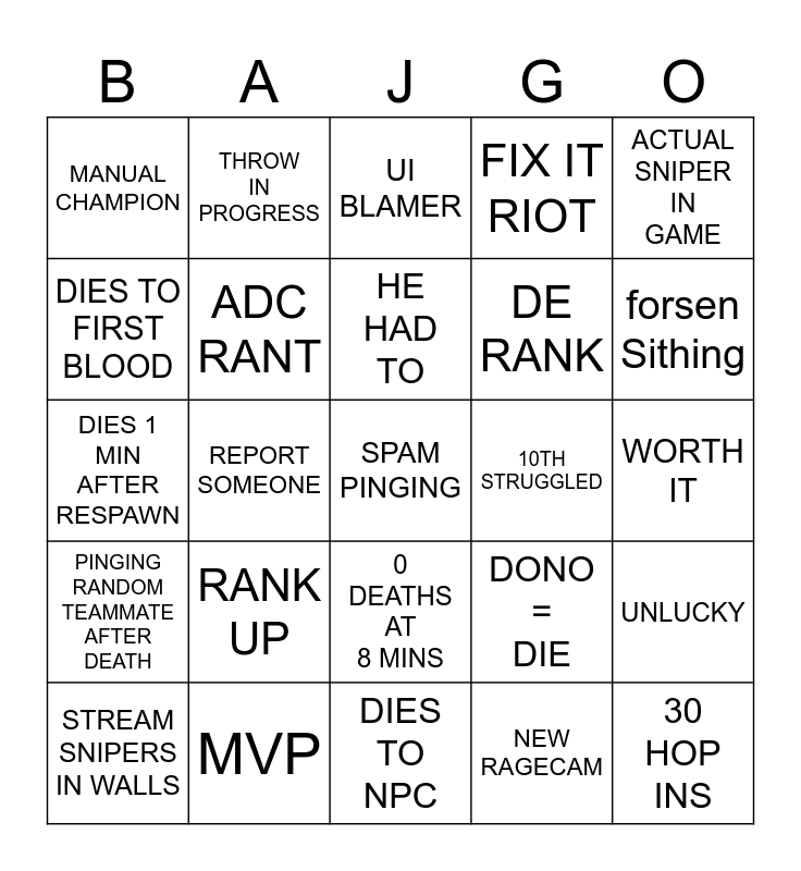 This bingo card has 25 words: RANK UP, DIES TO NPC, HE HAD TO, STREAM SNIPERS IN WALLS, ACTUAL SNIPER IN GAME, MANUAL CHAMPION, DIES TO FIRST BLOOD, THROW IN PROGRESS, 10TH STRUGGLED, 0 DEATHS AT 8 MINS, DE RANK, DIES 1 MIN AFTER RESPAWN, DONO = DIE, UNLUCKY, ADC RANT, 30 HOP INS, WORTH IT, UI BLAMER, forsen Sithing, REPORT SOMEONE, SPAM PINGING, MVP, PINGING RANDOM TEAMMATE AFTER DEATH, FIX IT RIOT and NEW RAGECAM.