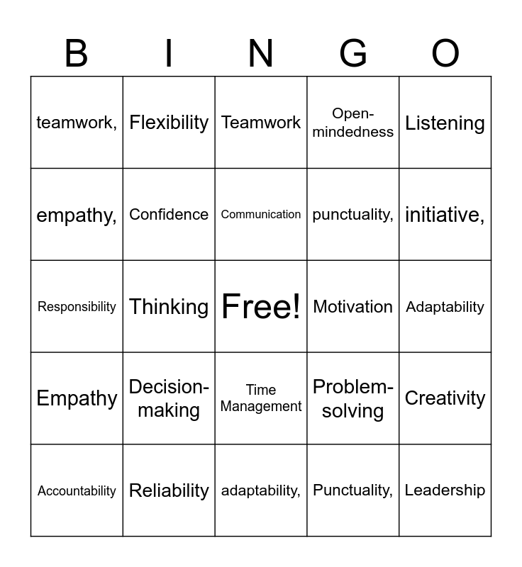 This bingo card has a free space and 32 words: Punctuality,, Critical, Thinking, Patience, Empathy, Confidence, Listening, Creativity, Flexibility, Respectfulness, Communication, Teamwork, Initiative, Professionalism, Motivation, Collaboration, Accountability, Responsibility, Time Management, Decision-making, Problem-solving, Integrity, Adaptability, Reliability, Leadership, Open-mindedness, punctuality,, empathy,, teamwork,, adaptability,, communication, and initiative,.