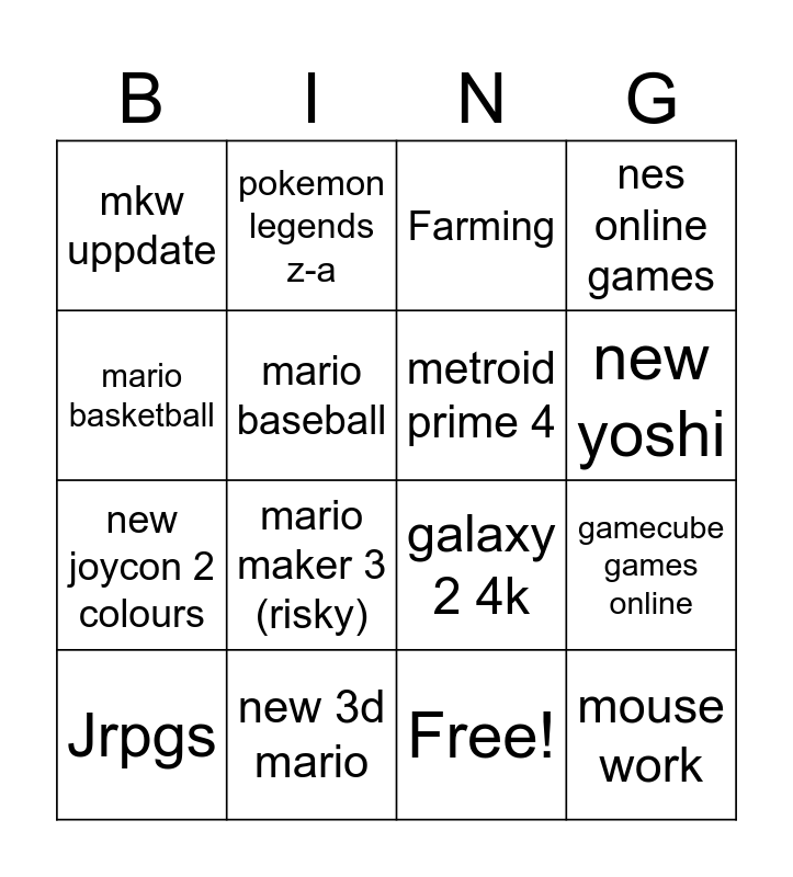 This bingo card has 17 words: Free!, Jrpgs, Farming, mkw uppdate, mario maker 3 (risky), nes online games, gamecube games online, metroid prime 4, new yoshi, mario baseball, new 3d mario, galaxy 2 4k, mario basketball, pokemon legends z-a, new joycon 2 colours, mario themed switch 2 and mouse work.