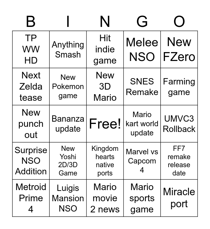 This bingo card has a free space and 24 words: New Yoshi 2D/3D Game, Luigis Mansion NSO, New 3D Mario, Metroid Prime 4, New FZero, TP WW HD, Next Zelda tease, Anything Smash, Mario kart world update, Kingdom hearts native ports, SNES Remake, New punch out, Marvel vs Capcom 4, FF7 remake release date, New Pokemon game, Mario sports game, UMVC3 Rollback, Hit indie game, Farming game, Bananza update, Miracle port, Surprise NSO Addition, Melee NSO and Mario movie 2 news.
