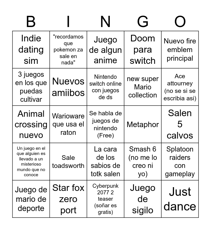 This bingo card has a free space and 24 words: Sale toadsworth, Star fox zero port, Nintendo switch online con juegos de ds, Juego de mario de deporte, Nuevo fire emblem principal, Indie dating sim, 3 juegos en los que puedas cultivar, "recordamos que pokemon za sale en nada", Metaphor, La cara de los sabios de totk salen, new super Mario collection, Animal crossing nuevo, Smash 6 (no me lo creo ni yo), Splatoon raiders con gameplay, Nuevos amiibos, Juego de sigilo, Salen 5 calvos, Juego de algun anime, Ace attourney (no se si se escribia asi), Warioware que usa el raton, Just dance, Un juego en el que alguien es llevado a un misterioso mundo que no conoce, Doom para switch and Cyberpunk 2077 2 teaser (soñar es gratis).