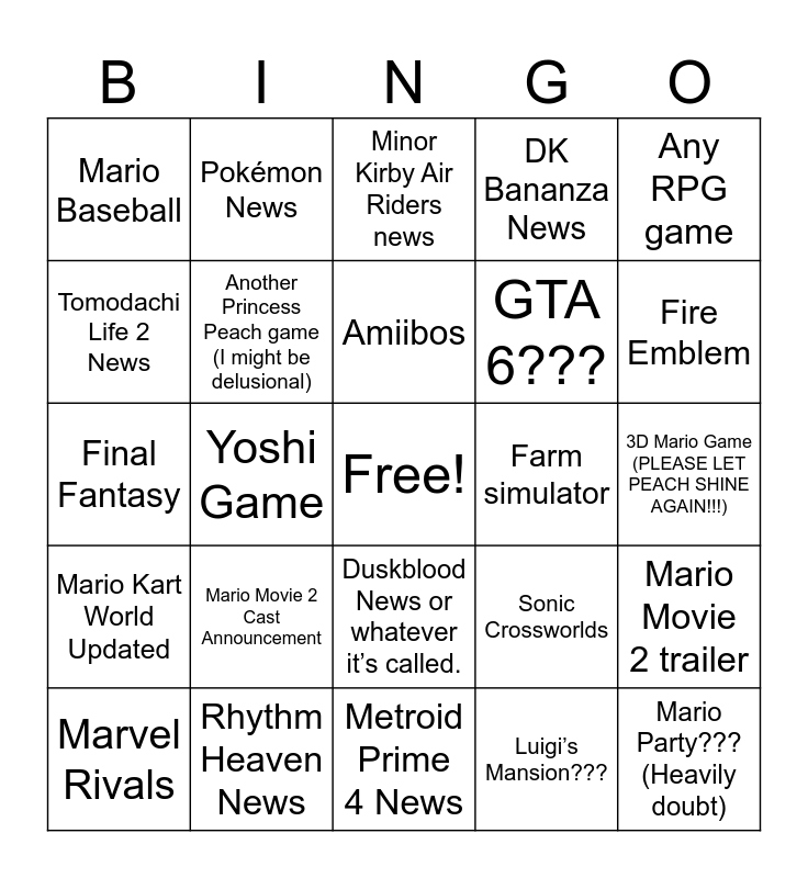 This bingo card has a free space and 24 words: Mario Movie 2 Cast Announcement, Rhythm Heaven News, Amiibos, Marvel Rivals, Any RPG game, Mario Baseball, Tomodachi Life 2 News, Pokémon News, Farm simulator, Duskblood News or whatever it’s called., GTA 6???, Final Fantasy, Sonic Crossworlds, Mario Movie 2 trailer, Another Princess Peach game (I might be delusional), Luigi’s Mansion???, 3D Mario Game (PLEASE LET PEACH SHINE AGAIN!!!), Minor Kirby Air Riders news, Fire Emblem, Yoshi Game, Mario Party??? (Heavily doubt), Mario Kart World Updated, DK Bananza News and Metroid Prime 4 News.